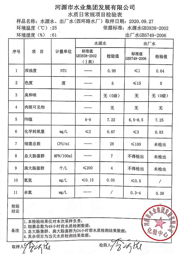 2020年9月27日水質(zhì)檢驗(yàn)報(bào)告