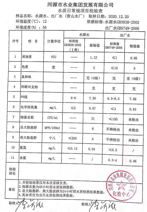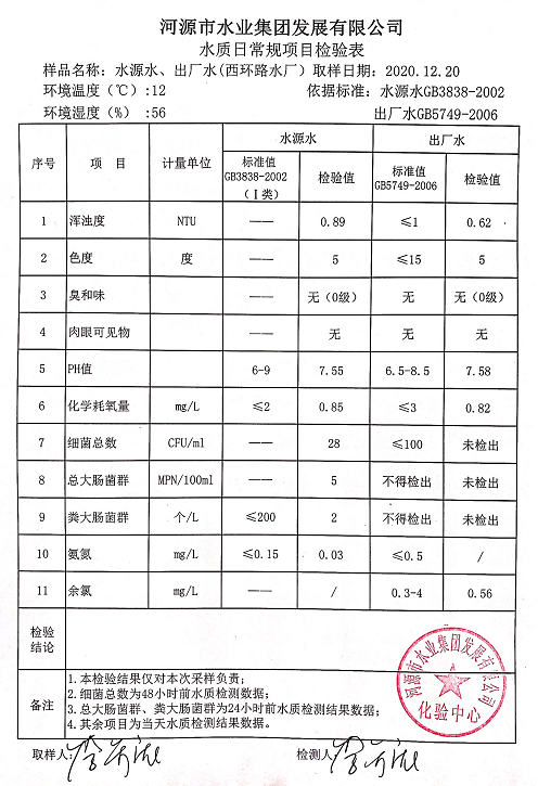 2020年12月20日水質(zhì)檢驗(yàn)報告
