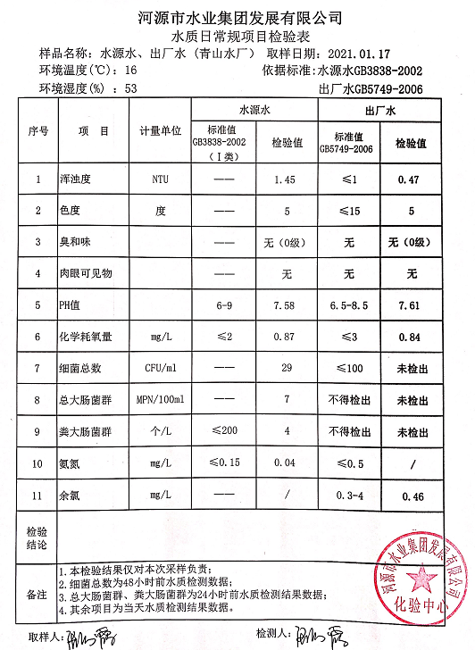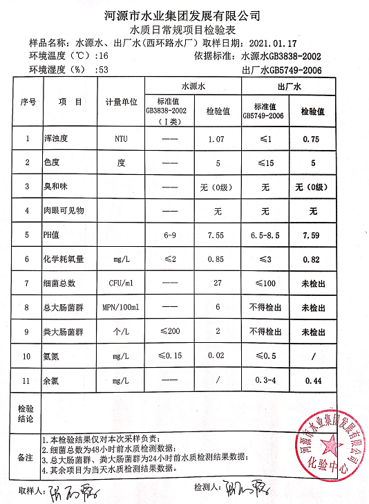 2021年1月17日水質(zhì)檢驗(yàn)報告