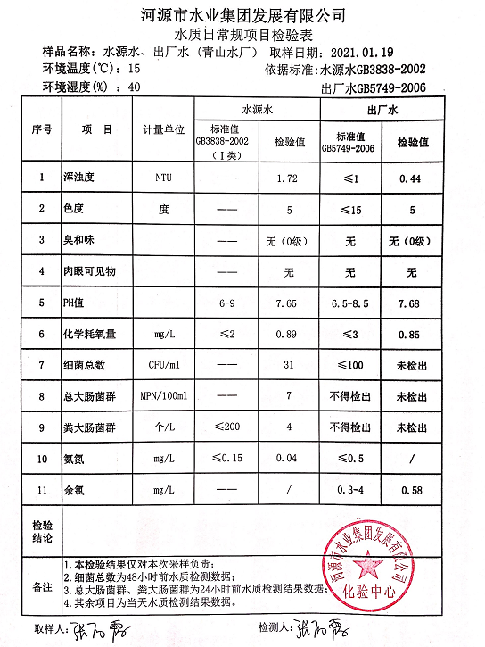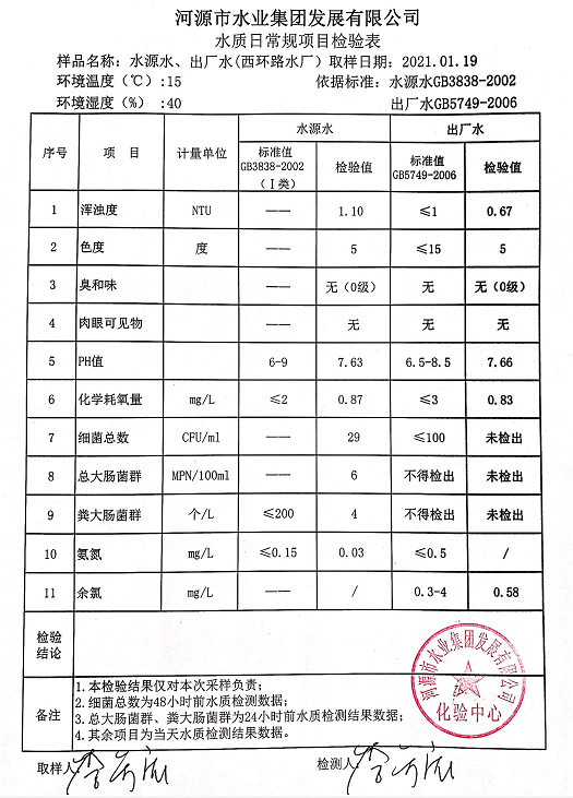 2021年1月19日水質(zhì)檢驗(yàn)報(bào)告