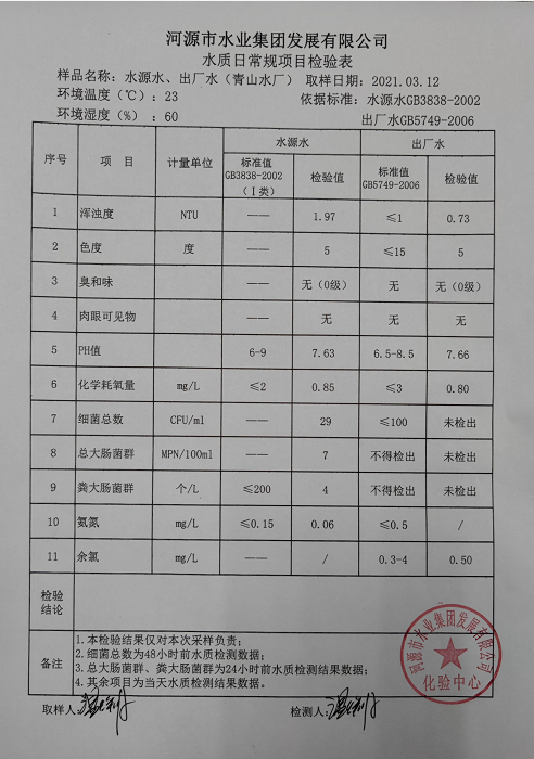2021年3月12日水質(zhì)檢驗(yàn)報告