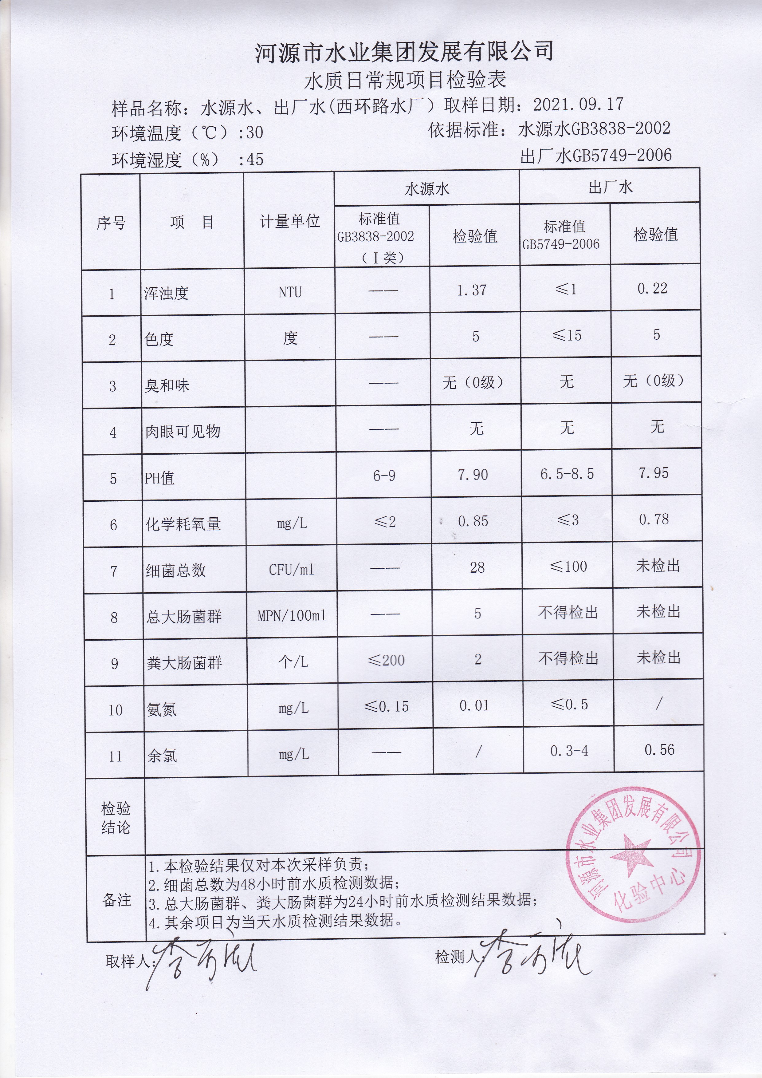 2021年9月17日水質(zhì)檢驗報告 ??