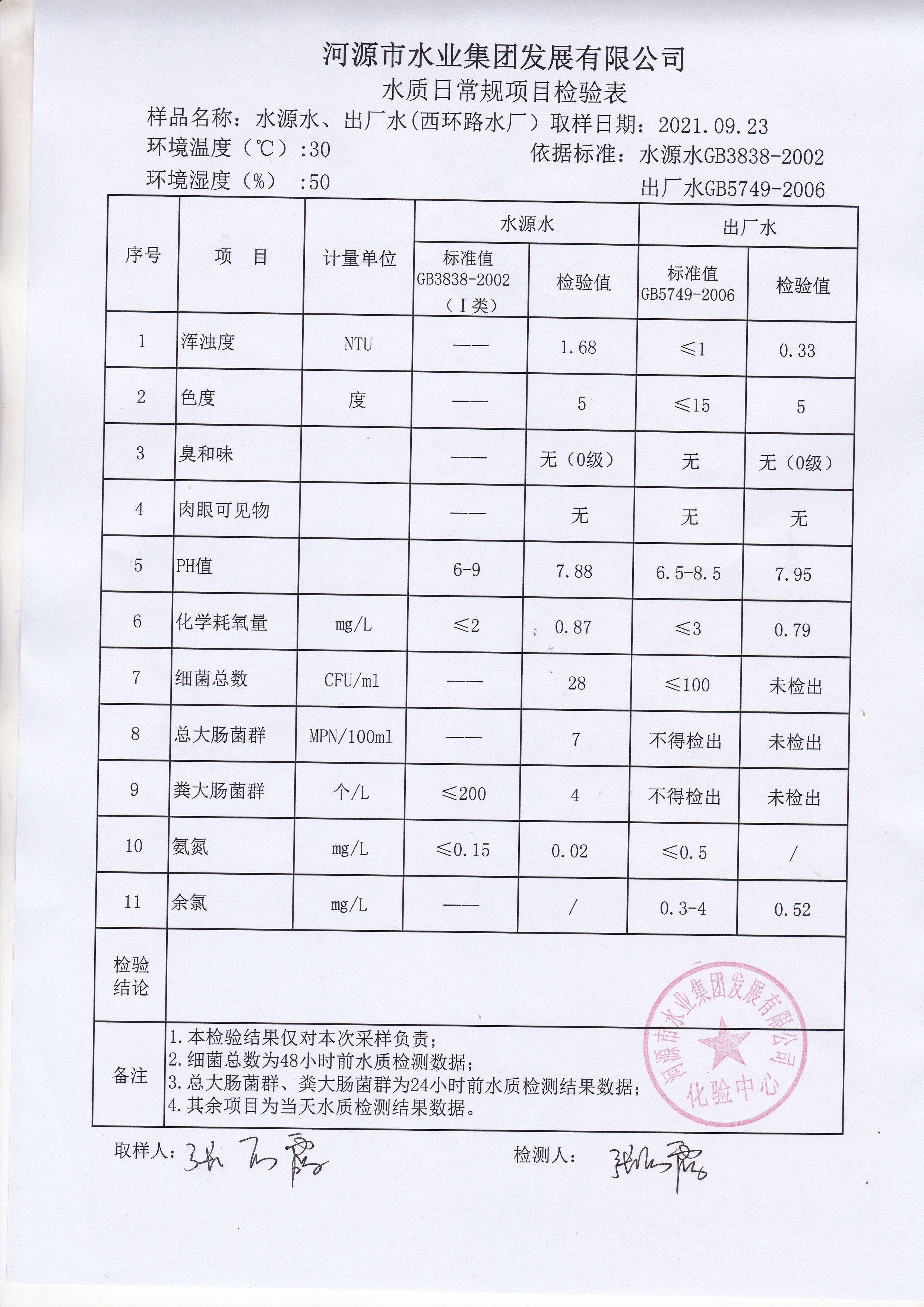 2021年9月23日水質(zhì)檢驗報告