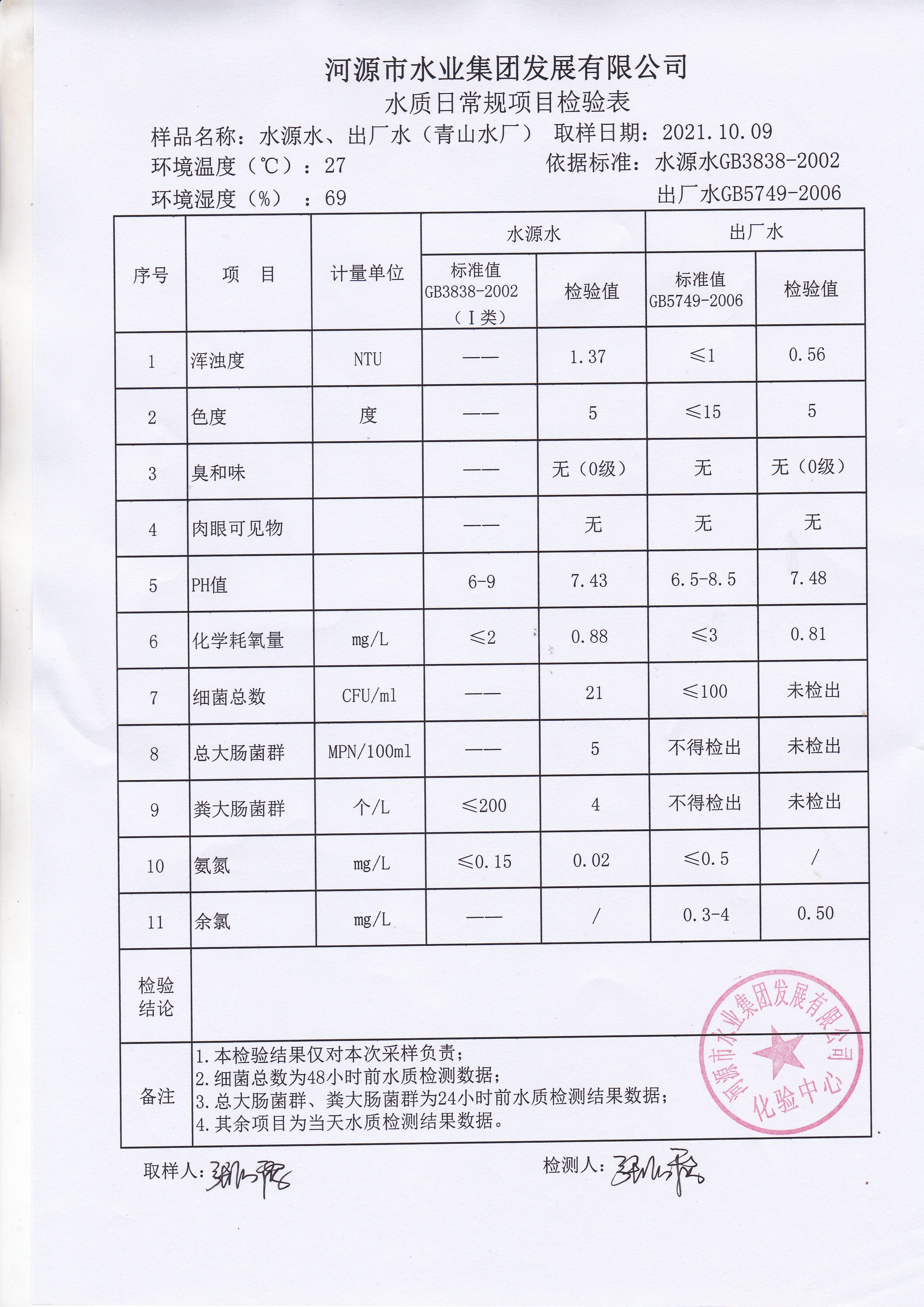 2021年10月9日水質(zhì)檢驗(yàn)報(bào)告