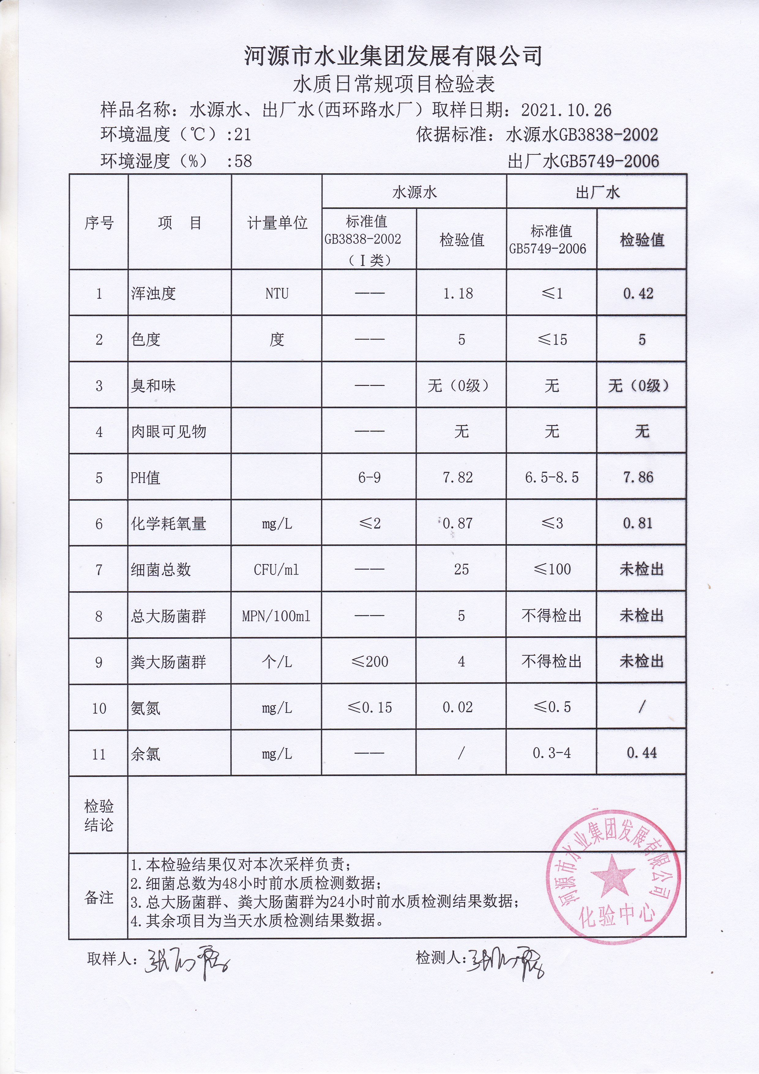 2021年10月26日水質(zhì)檢驗報告
