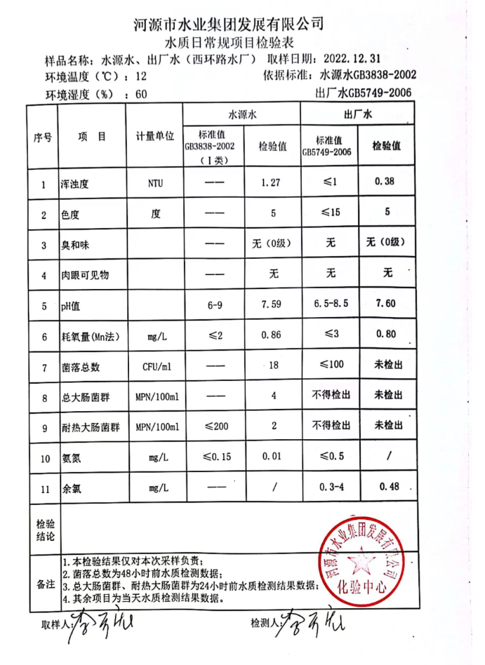 2022年12月31日水質(zhì)檢驗報告