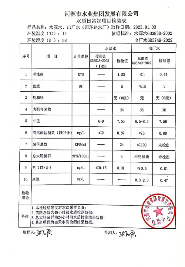 2023年1月3日水質(zhì)檢驗(yàn)報(bào)告