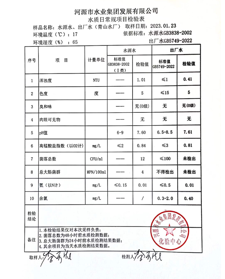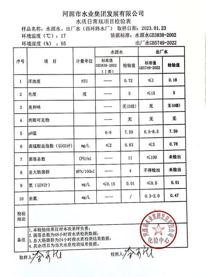 2023年1月23日水質(zhì)檢驗(yàn)報告