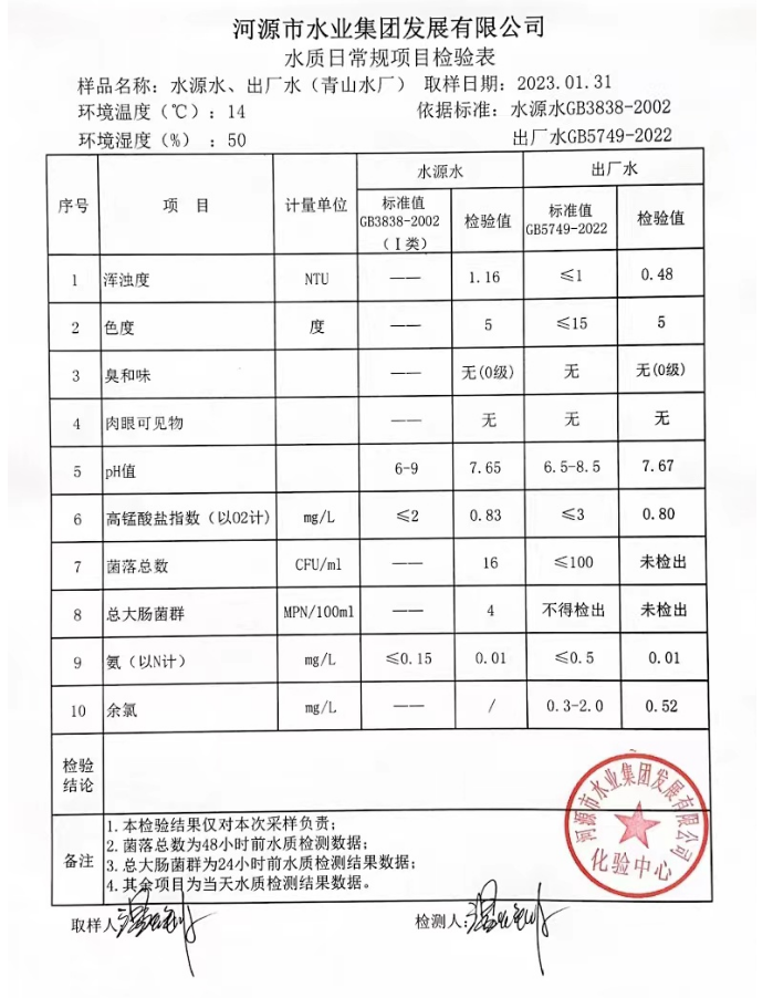2023年1月31日水質(zhì)檢驗報告