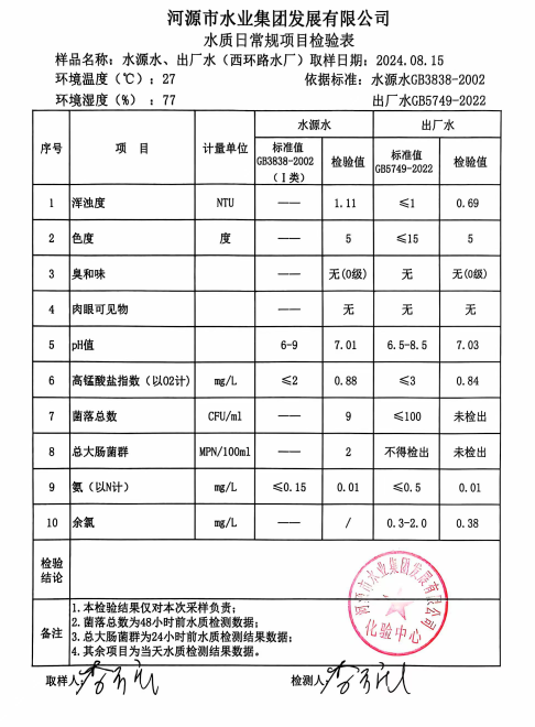 2024年8月15日水質(zhì)檢驗(yàn)報(bào)告